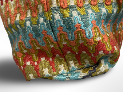 LIVID Β colors of orange and turquoise cover this beautiful zig zag print. The spacious interior is perfect for all your daily essentials, while the adjustable drawstring closure with wooden bead accents adds a touch of rustic charm. The comfortable, patterned straps make it easy to carry, whether you’re heading to the market, a festival, or a casual day out. Β Β